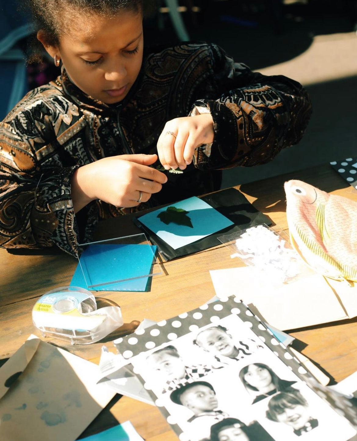 Through our cyanotype kit workshop, families harnessed the power of the sun to create their own works of art, using paper cut outs of daisy dots and wavy stripes from our universe and items found in nature (leaves, twigs, flowers).
